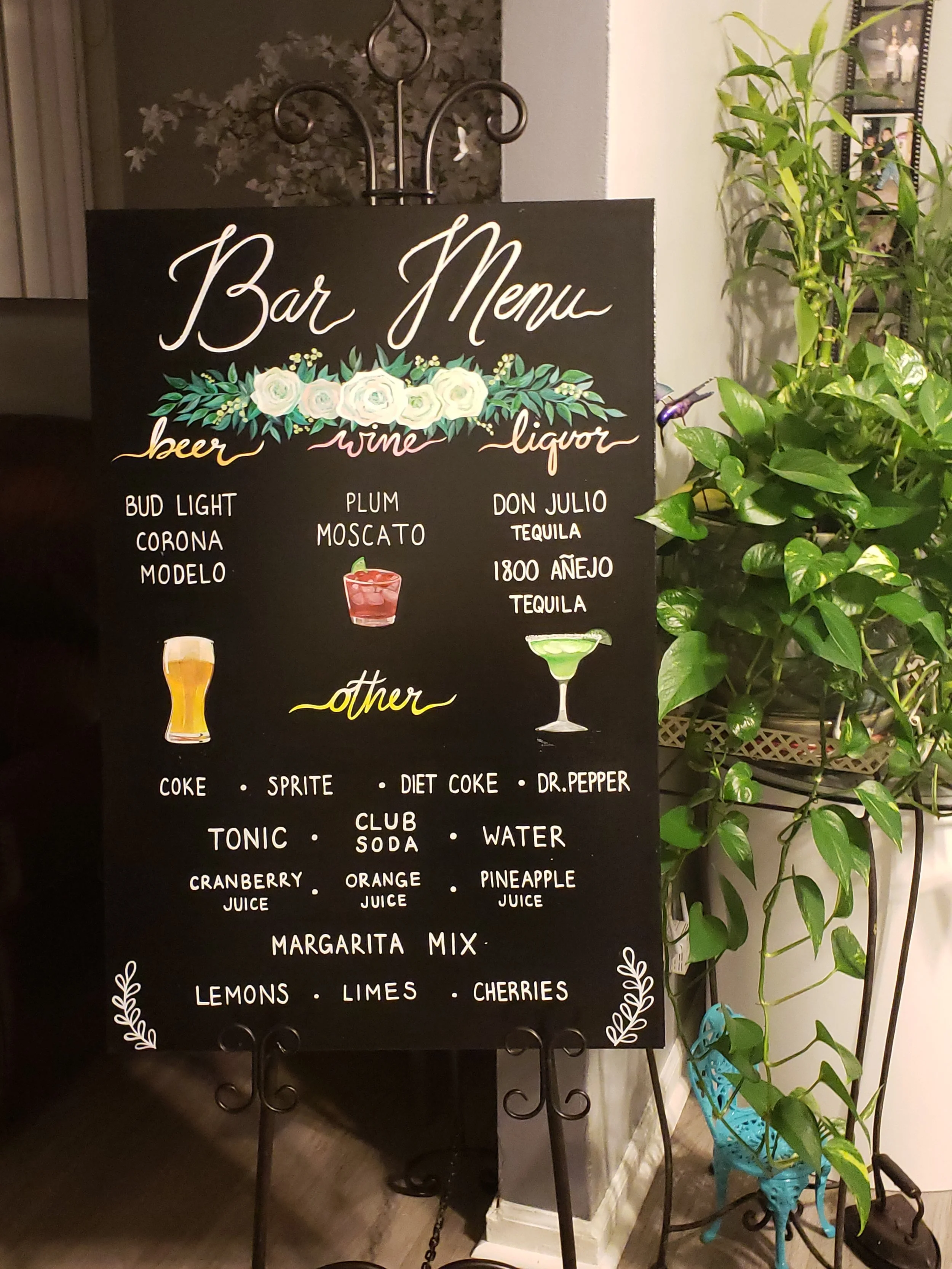 In the Wedding Decorative Mirror and Bar Menu project, I was tasked with creating a unique entrance piece that displayed the bride and groom’s names, all while complementing the wedding’s color scheme. This decorative piece is meant to be seen by everyone that makes their way into the ceremony highlighting whom this event is for all while welcoming their guests. The bar menu on the other hand, was created in order to display what drinks would be available after the ceremony. This is aimed for the bride and groom’s guests, helping them oversee the drink options they have. The hanging bouquet of flowers on the decorative mirror also follows the color scheme of the wedding as well as the instruction of having an elegant and realistic touch of nature onto it.
